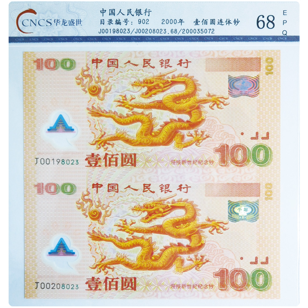 正面圖案:正面圖案主景是以坐落在北京北海公園北岸的九龍壁中第三條龍(亦稱升龍)為設計依據。只見矯健雄姿,威嚴無比的大升龍從大海中騰空而起,張開百川大口,直視左側熊熊燃燒的“火球”,象是和“火球”跳著吉祥舞蹈,迎接新千年的到來,迎接我國首套塑料紀念鈔的橫空出世。
