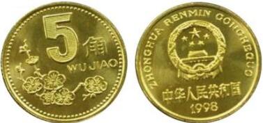 梅花5角硬幣直徑20.50毫米,厚1.65毫米,質量3.80克。幣正面為梅花圖案,面值黑體字"5角",并注漢語拼音"WUJIAO"。幣外周柱面間斷鑄有6段直齒,每段8條。背面圖案為國徽、宋體漢字"中華人民共和國"、"ZHONGHUARENMINGONGHEGUO"、阿拉伯數字年號。
